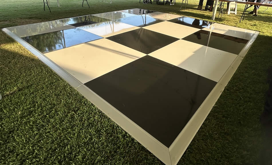 Description: Available up to 441 square feet. Get your groove on with our portable dance floor. 441 sq feet of dance floor scalable in different configurations. 15' x 15' or 16' x 16' or 10' x 20' or 20' x 21' or 20' x 21' Wooden floor.