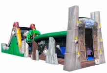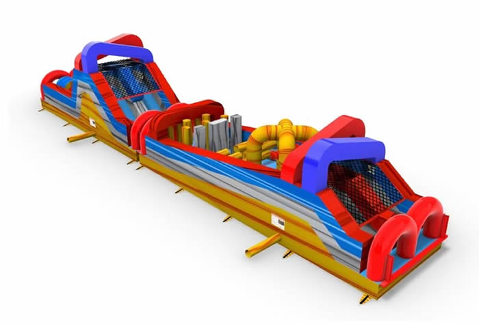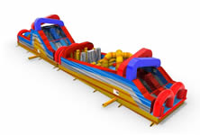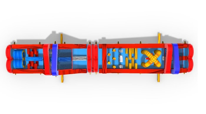 Description: Two riders can play at a time as they race through countless different elements. Riders start off by going through the entrance (1) red arches, than under the (2) tunnels and around the (3) horizontal popups, now riders climb the (4) climbing wall and down the (5) dual lane slide and out the (6) red arches. The second piece of the 65' Obstacle Course has (7) vertical popups hanging, (8) vertical wall, (9) horizontal popups, (10) X shaped obstacle structure, and lastly (11) dual lane slide down to the finish line. Dimensions: 11'6"W x 65'L x 13'3